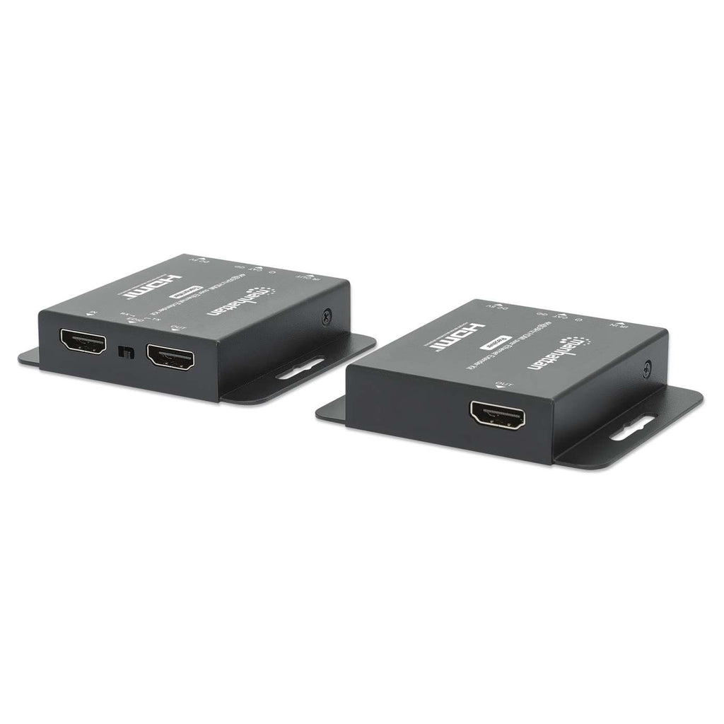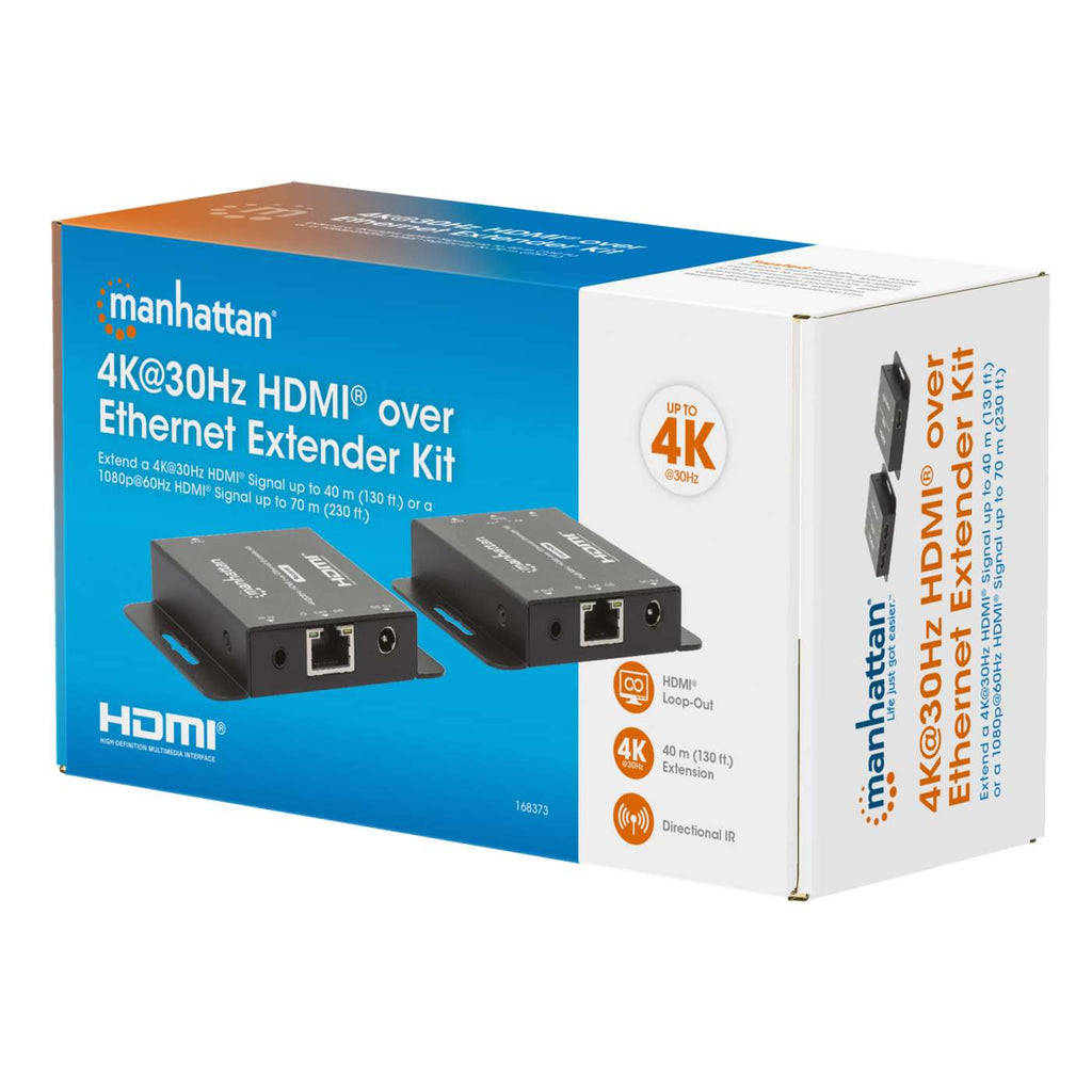 The Manhattan 4K HDMI over Ethernet Extender Kit lets you transmit an audio/video signal in 4K@30Hz (3840 × 2160) up to 40 m (164 ft.) or 1080p@60Hz up to 70 m (230 ft.) via a single RJ45 Cat6 Ethernet cable. The Kit provides reliable video and multichannel audio transmission for your streaming device, gaming console (PS4, PS4 Pro, PS5, Xbox Series X/S, Switch etc.), Blu-ray player, satellite receiver, PC, laptop, MacBook® or other HDMI device over longer distances than standard HDMI cables alone can achieve. The transmitter and receiver have additional 3.5 mm jacks for Infrared (IR) inputs that let you control the source or display at either end of the setup.