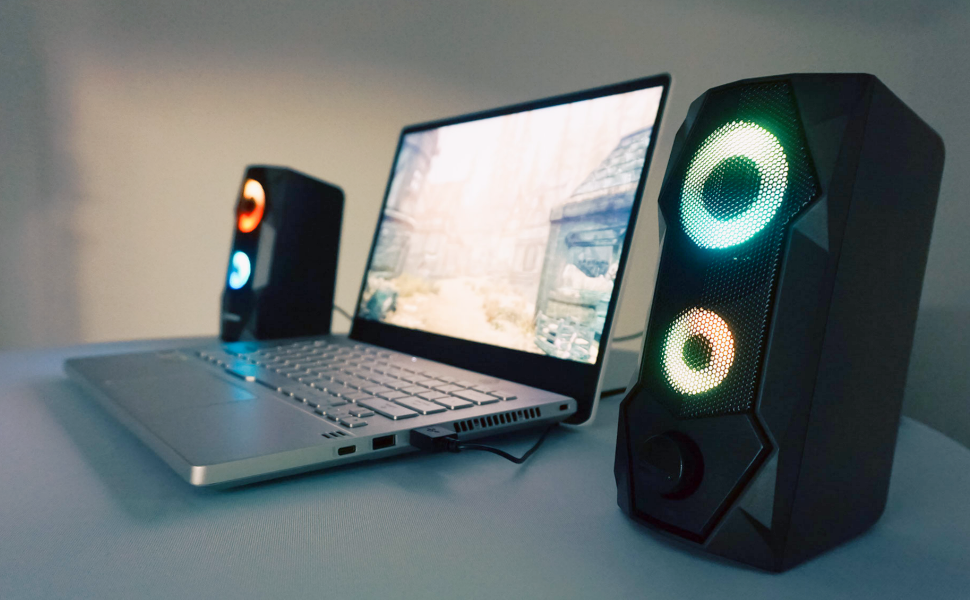 PC Speakers - wired 3.5 mm Aux and USB power for gaming and more - crystal-clear dual-channel sound with simple setup and atmospheric color-LED lighting